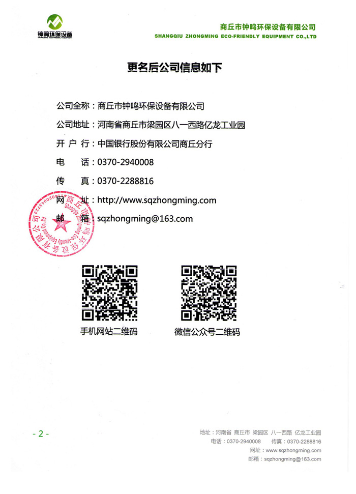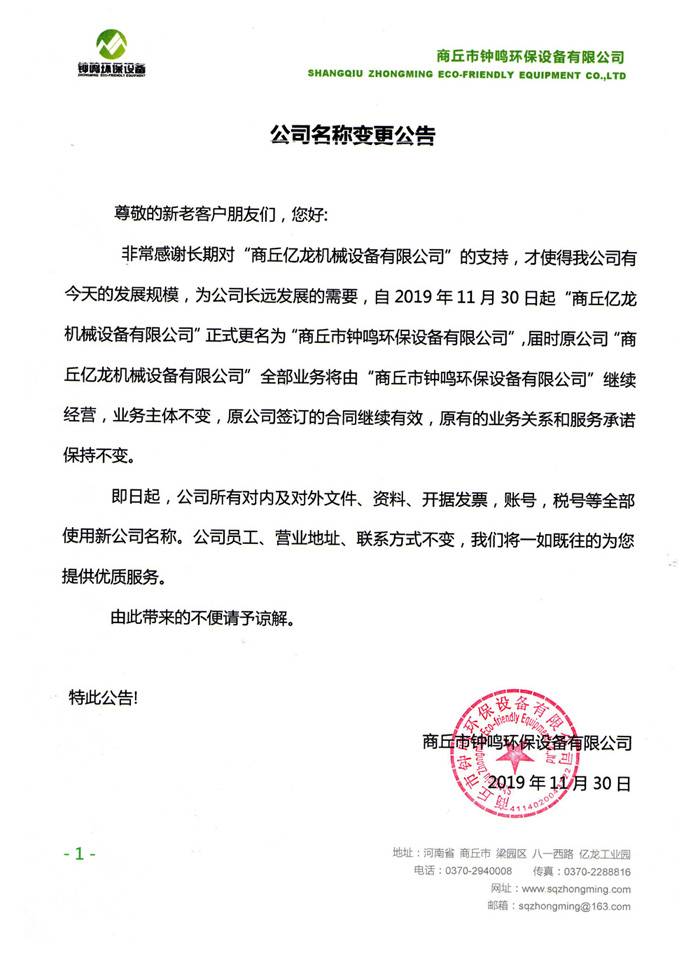 即日起,商丘億龍正式更名為鐘鳴環保設備,具體請查看更名公告。