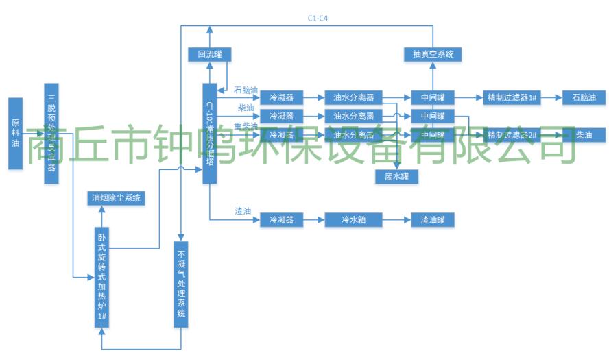本生產裝置是利用廢機油生產柴油及副產品生產線,裝置主要配置;預處理反應罐、臥式旋轉加熱爐,常壓分餾塔、列管式冷凝器、冷卻水槽、油水分離器,過濾器,精制過濾罐;預處理系統;加熱系統;蒸餾系統;冷凝系統;真空負壓及廢氣回收處理利用系統;消煙除塵系統;安全消防、防爆、靜電接地系統;水處理循環利用系統;自控半自動控制系統等組成。本裝置采取臥式旋轉加熱爐加熱可以連續式生產,處理量為5-10噸 (根據客戶需求,可定制間歇式生產線)