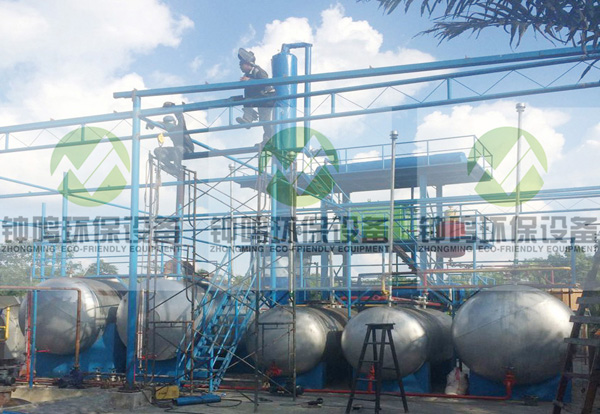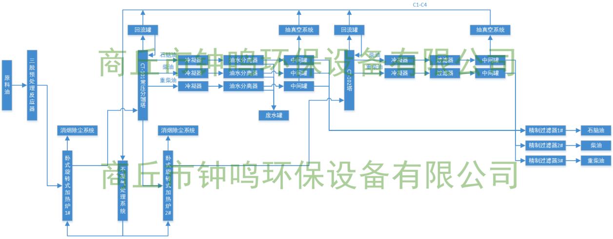 本生產(chǎn)裝置是利用輪胎油生產(chǎn)柴油及副產(chǎn)品生產(chǎn)線,裝置主要配置;預(yù)處理反應(yīng)罐、臥式旋轉(zhuǎn)加熱爐1# 2# 2臺(tái)套,常壓分餾塔、減壓分餾塔、列管式冷凝器、冷卻水槽、油水分離器,過濾器,精制過濾罐,預(yù)處理系統(tǒng),加熱系統(tǒng),蒸餾系統(tǒng),冷凝系統(tǒng),真空負(fù)壓及廢氣回收處理利用系統(tǒng),消煙除塵系統(tǒng)、安全消防防爆靜電接地系統(tǒng),水處理循環(huán)利用系統(tǒng)、自控半自動(dòng)控制系統(tǒng)等組成。