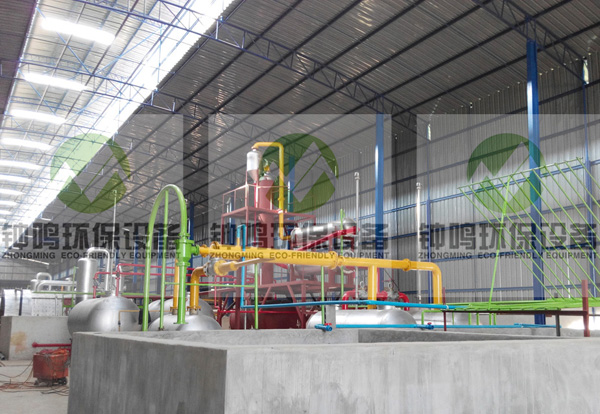 本生產裝置是利用塑料油生產柴油及副產品生產線,裝置主要配置;預處理反應罐、臥式旋轉加熱爐1# 2# 2臺套,常壓分餾塔、減壓分餾塔、列管式冷凝器、冷卻水槽、油水分離器,過濾器,精制過濾罐,預處理系統,加熱系統,蒸餾系統,冷凝系統,真空負壓及廢氣回收處理利用系統,消煙除塵系統、安全消防防爆靜電接地系統,水處理循環利用系統、自控半自動控制系統等組成。